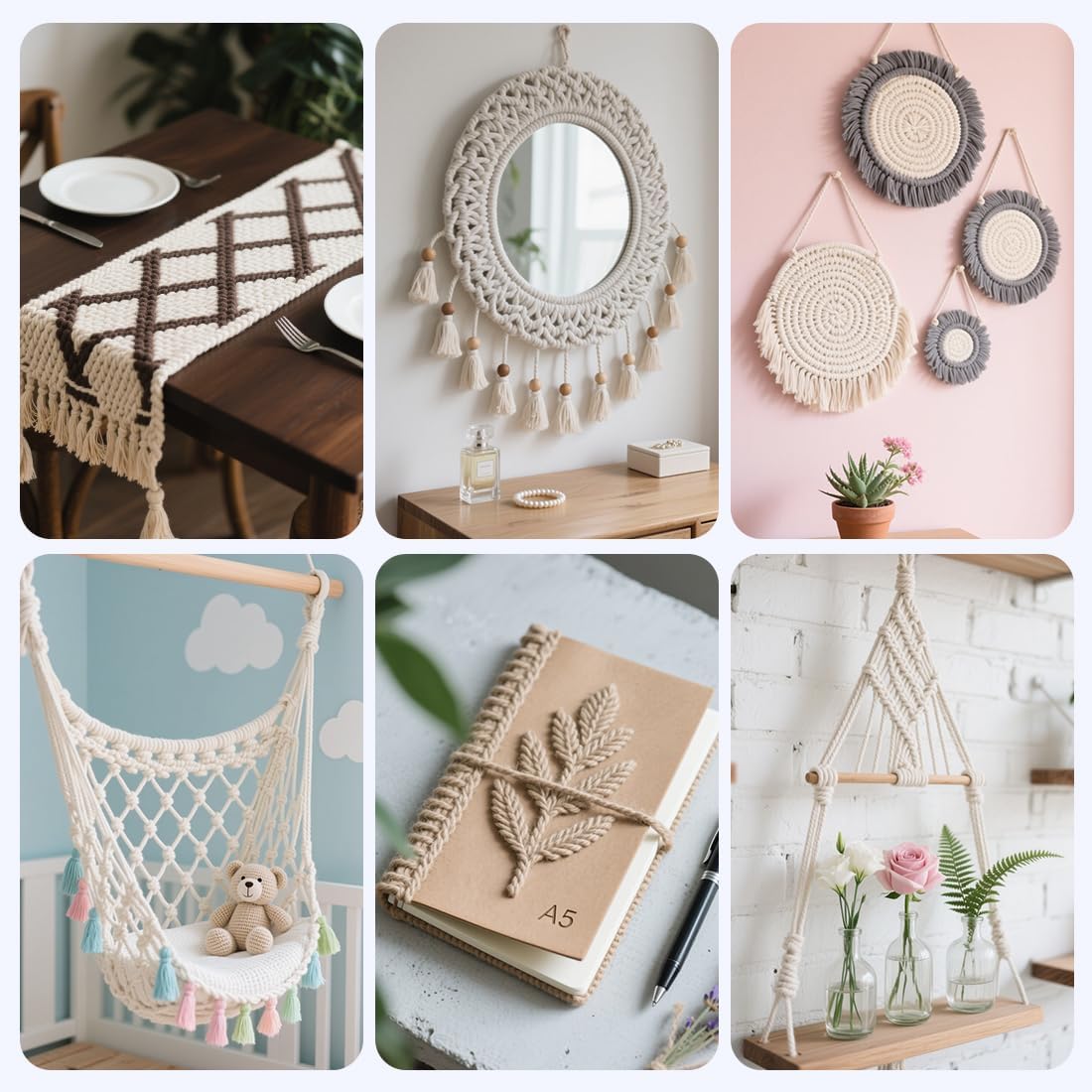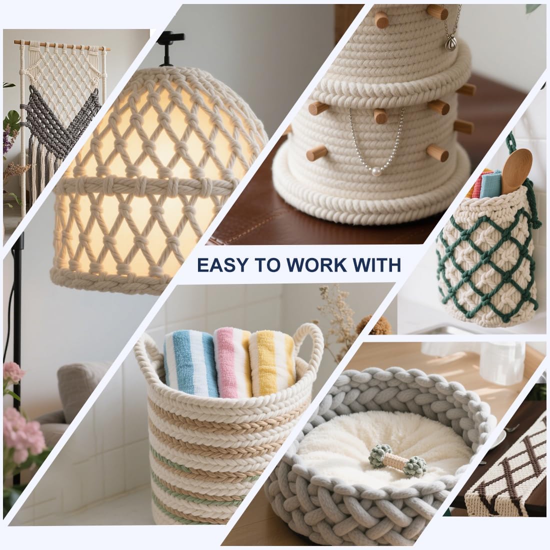 - 【GREAT FOR CRAFTING】The high quality of the materials used and the sturdy braided design make our craft rope very strong and durable, yet still soft somehow to the touch. And these thin ropes can be easily knotted. Great for making a variety of handmade products such as rope bowls, coasters, placemats, purses, baskets, cat scratching posts and so on.