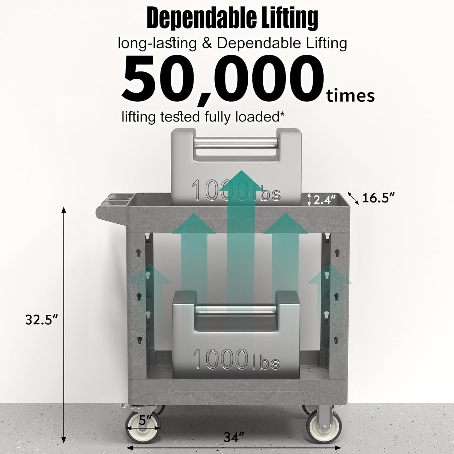 Utility Cart on Wheels, 1000 lbs Capacity Rolling Service Cart, 34 x 17 Inch Work Carts, 2 Shelf Heavy Duty Plastic Tool Cart, Lipped Shelves, for Warehouse, Garage, Cleaning, Gray