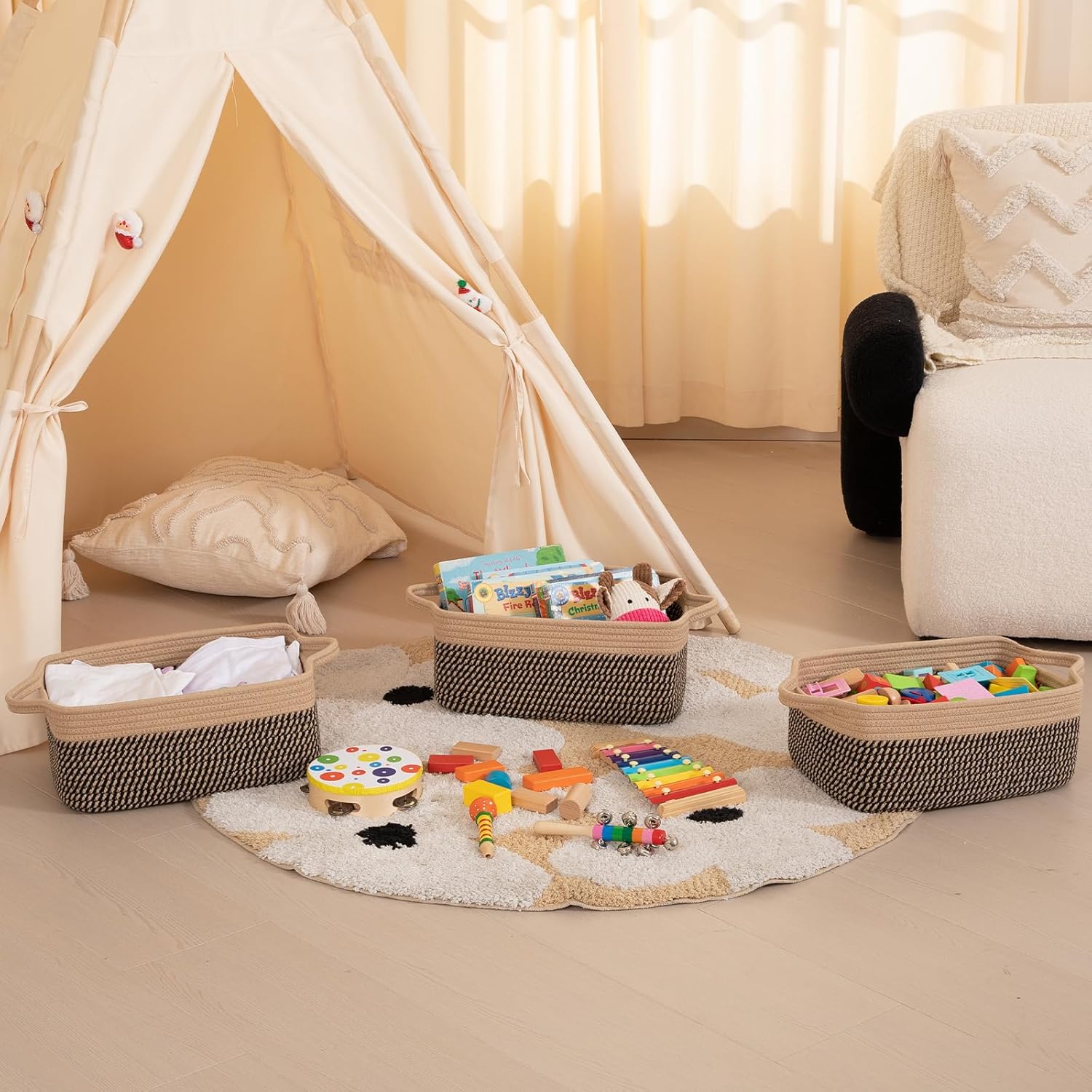 OIAHOMY 3 Pack Storage Baskets for Organizing, Woven Cotton Rope Basket for Shelves, Closet Organizer Bins with Handles, Rectangle Toy Organization, 13.78''×9.84''×5.5'', Brown & Black
