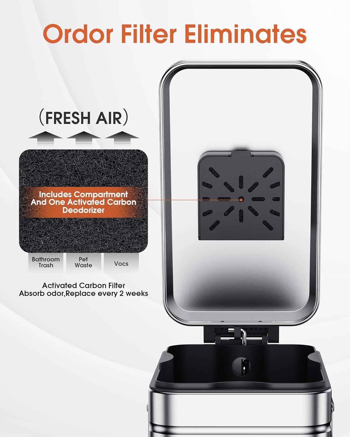 - Odor-Free: The Odor Control trash can included compartment and activated carbon deodorizer absorbs waste odors, 360° sealed space prevents odors from escaping from the can, making your space cleaner