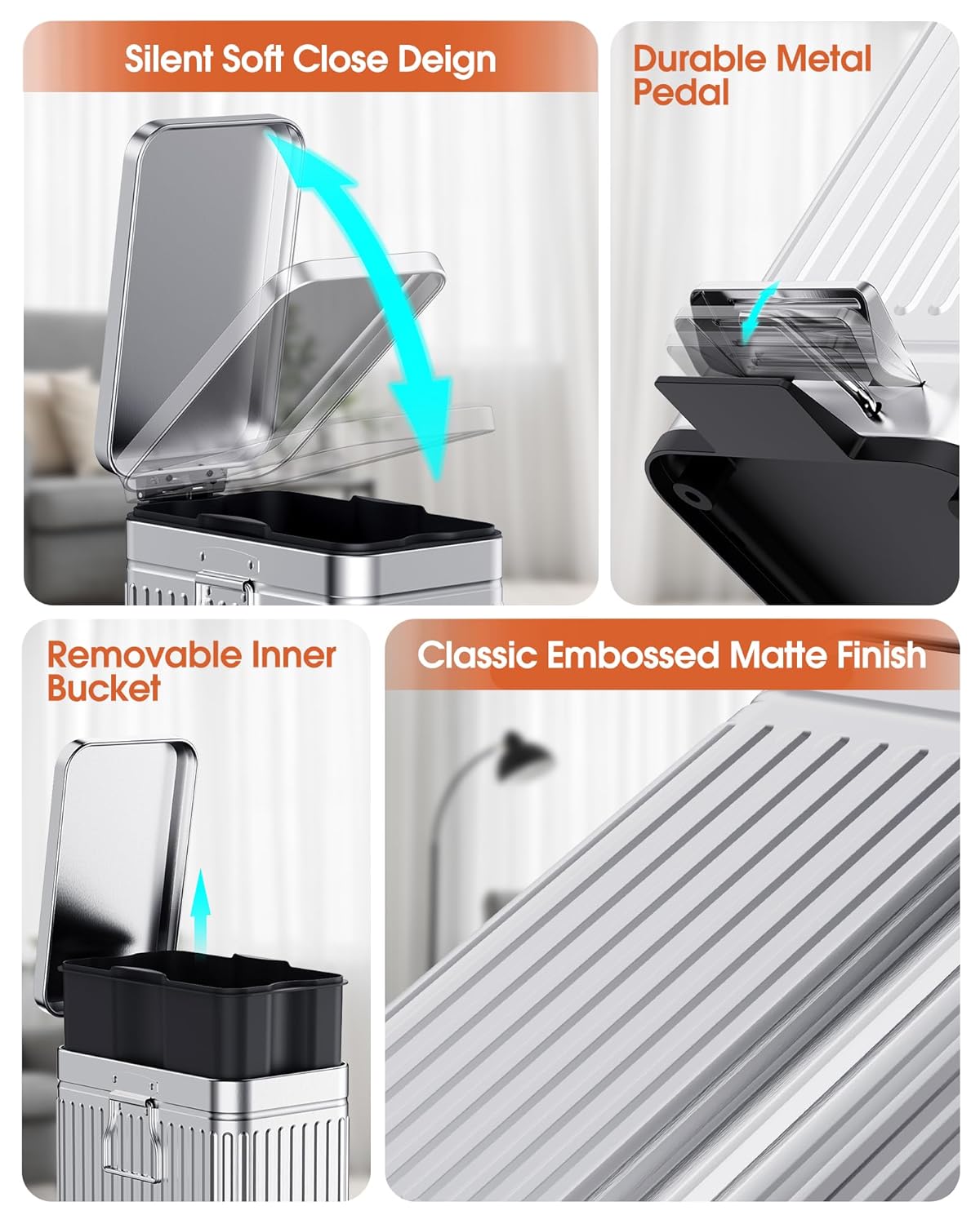 - Removable Inner Bucket: Our trash cans feature a removable inner bucket that makes trash disposal easy; There is a carry handle on the back of the slim trash can to move it easier