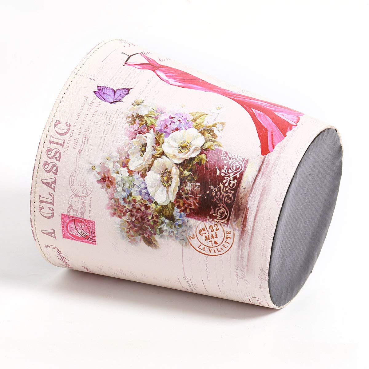 - DESIGN: Decorative waste basket featuring vintage-inspired artwork with a red evening gown and floral arrangement against a classic script background