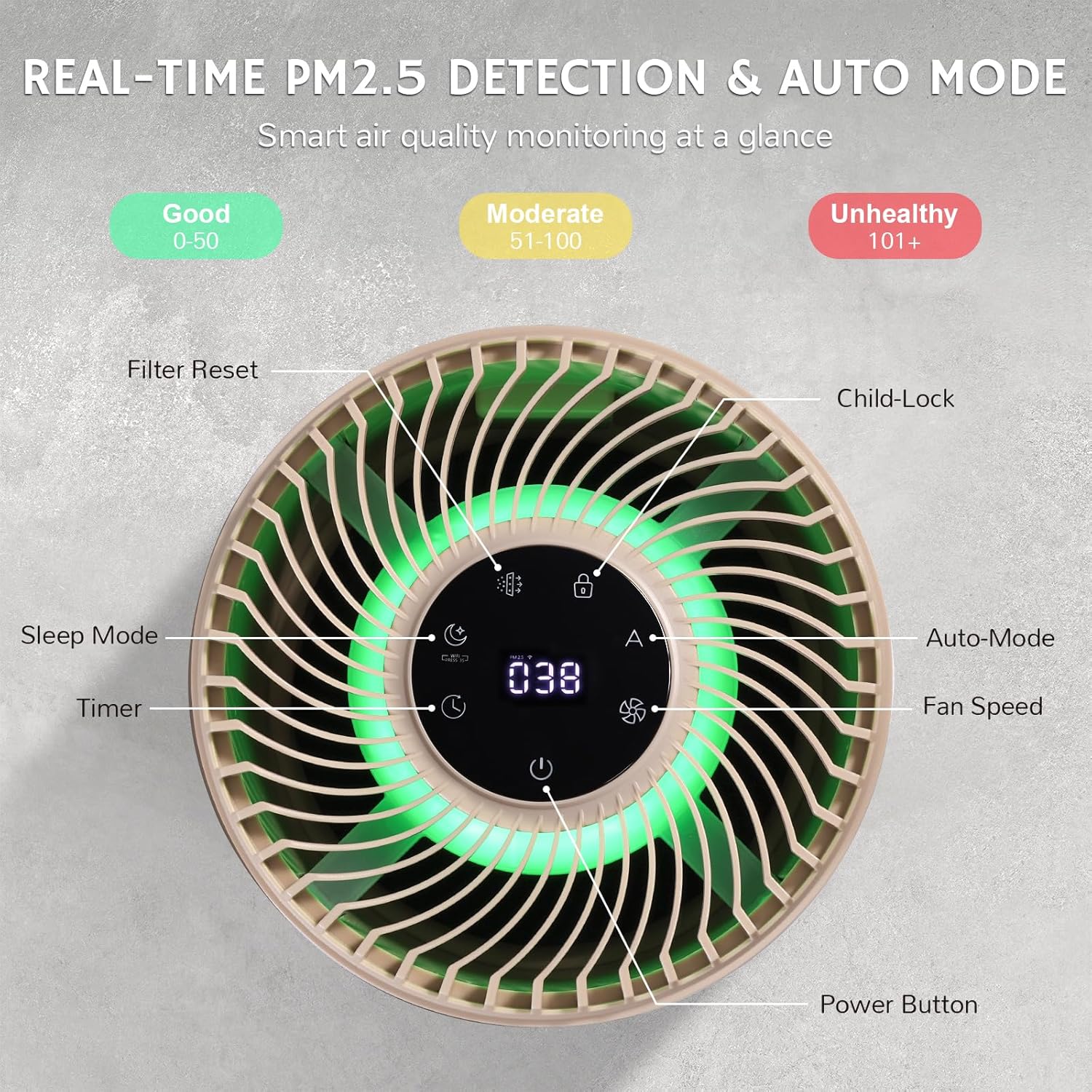 - Integrated PM 2.5 Sensor: With an integrated air quality sensor, this purifier monitors and responds to changes in air quality, providing real-time feedback and ensuring optimal purification for any size room.