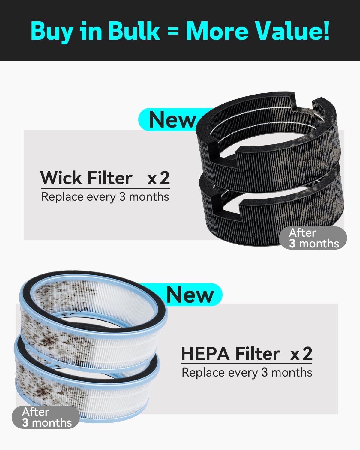 - COST-EFFECTIVE BUNDLE: Each set includes 2 HEPA filters + 2 Wick filters. Buying in bulk means save money