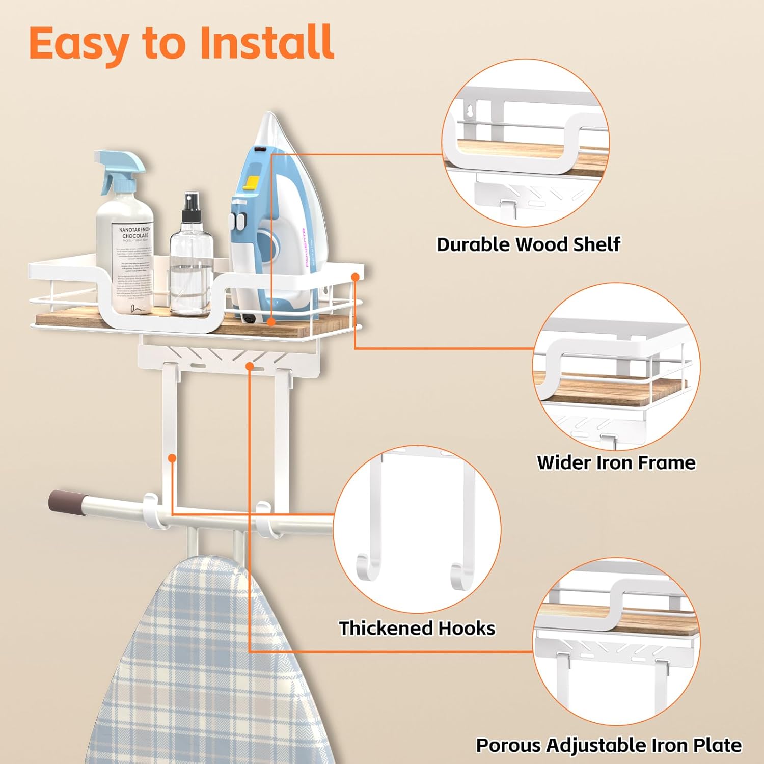 - MAKING YOUR HOME TIDY: The shelves for room wall small iron board hanger can keep all your items in one place, effectively use and organize your space. The ironing board hanger comes with storage metal wooden baskets and removable hooks to hold your iron, ironing stand, spray bottle and other ironing accessories for easy access.