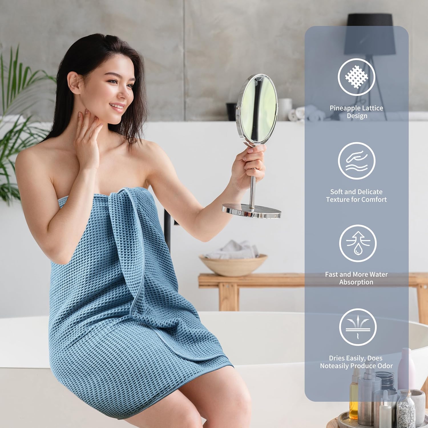 - Microfiber thoroughly dries faster and gentler than traditional fibers; waffle weave feels smoother on your skin and is less likely to collect lint or debris