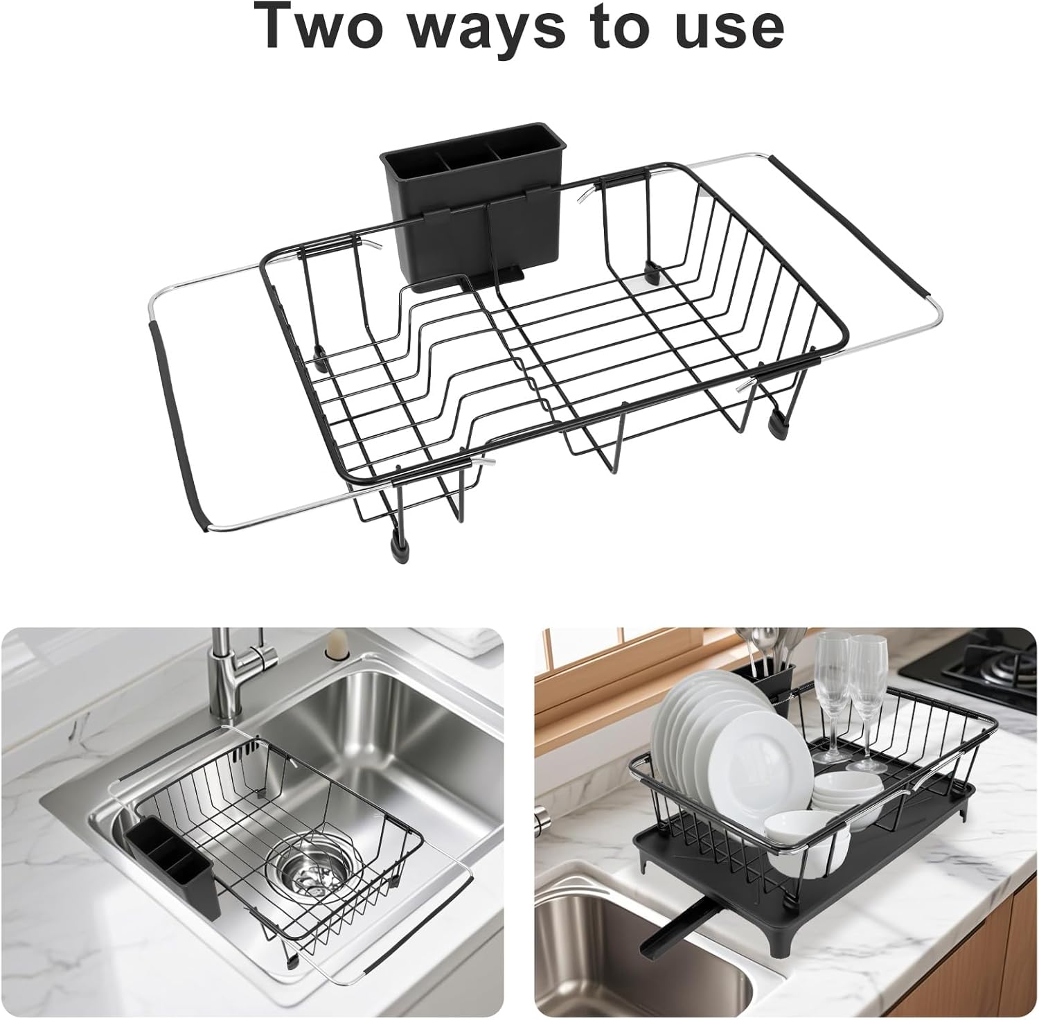 - Adjustable Supporting Bars: The supporting bar of the sink drying rack can be extended from 14.2" to 20.7", This dish rack is a great space saver that fits over most sinks. (NOTE: Please check if the size of your sink and the dish rack match before purchasing.)With the compact size and expandable design, this small dish drying rack is a perfect choice for 1-2 people or limited space.