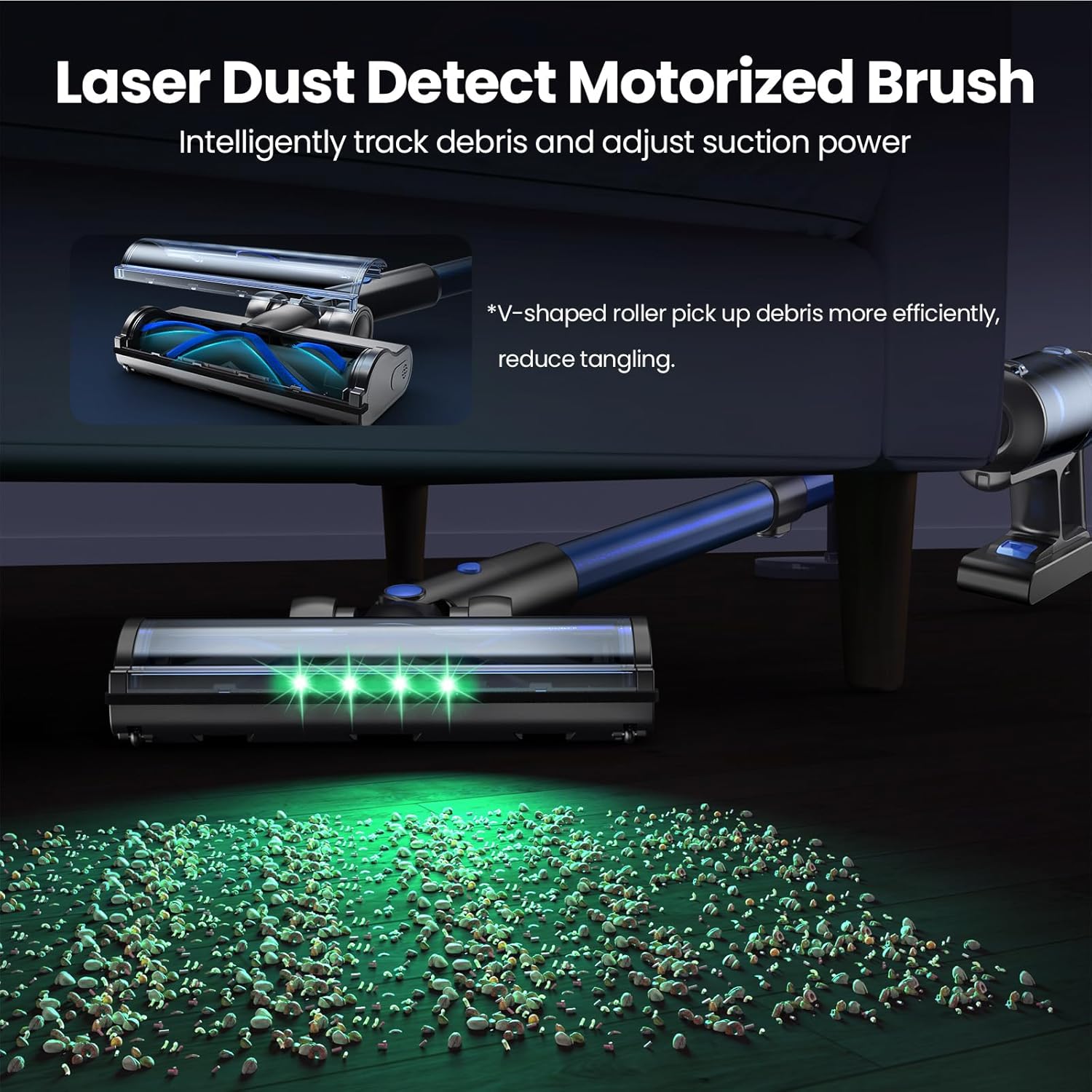 - 【Versatile Accessories】The main floor brush comes with green LED lights that make dust particles easier to see and clean. The V-shaped roller efficiently picks up debris while minimizing hair tangling, ideal for cleaning floors, carpets, and stairs. The 2-in-1 brush and crevice tool are perfect for cleaning furniture, car, and hard-to-reach areas, offering a multi-purpose cordless vacuum cleaner for home.