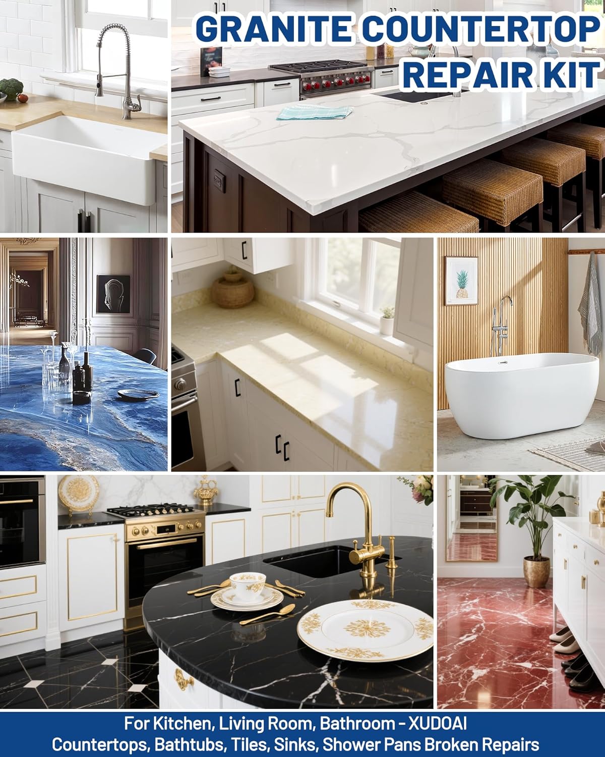 - Multi-Purpose Granite Countertop Repair Kit: Fully cured to form a solid surface for repairing hard surfaces such as granite, marble, quartz, corian and more. Countertop repair kit multi-color series for ceramic, acrylic, fiberglass. Commonly used on countertops, tile, bathtubs, sinks