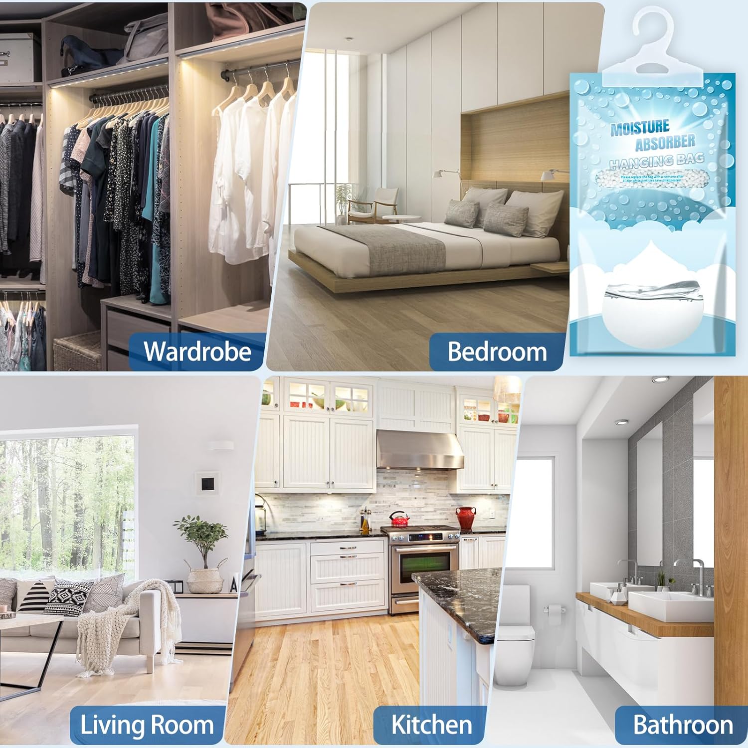 - ăWide UseăThe dehumidifier packagings is compact, making it easy to carry and store. This hanging dehumidifier bag is suitable for every space including closets, bedrooms, bathrooms, kitchens, basement. To effectively control humidity, you can adjust the number of dehumidification bags according to the size and humidity of each room.