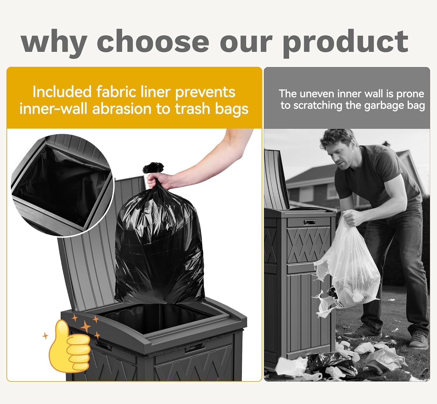 - Ultimate Liner Protection: No more frustrating rips; This outdoor trash can includes a durable, waterproof 210D Oxford fabric bag (80*120cm) designed to sit inside, shielding your garbage bags from tears