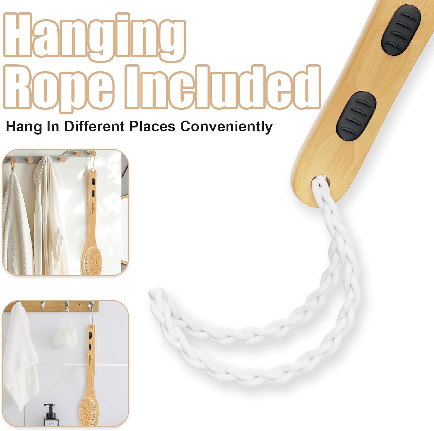 - Anti-slip grips(back scrubber): There is a non-slip rubber patch and a hanging rope at the handle for your comfort and ease of mind while brushing