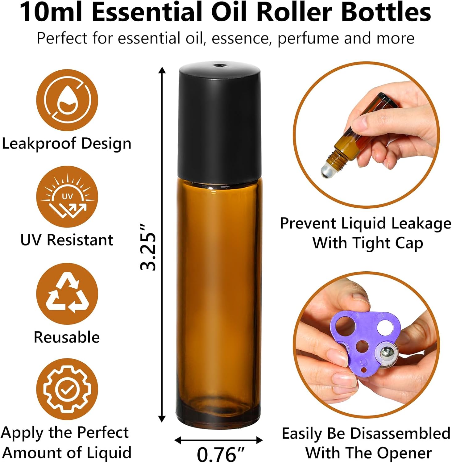 - Leakproof Design: These essential oil roller bottles feature a screw-thread finish and a secure black plastic cap, ensuring a tight seal to prevent leaks. The dual-cap design adds an extra layer of leakproof protection to your oils, perfumes and blends — safely put in your purse, gym bag or suitcase.