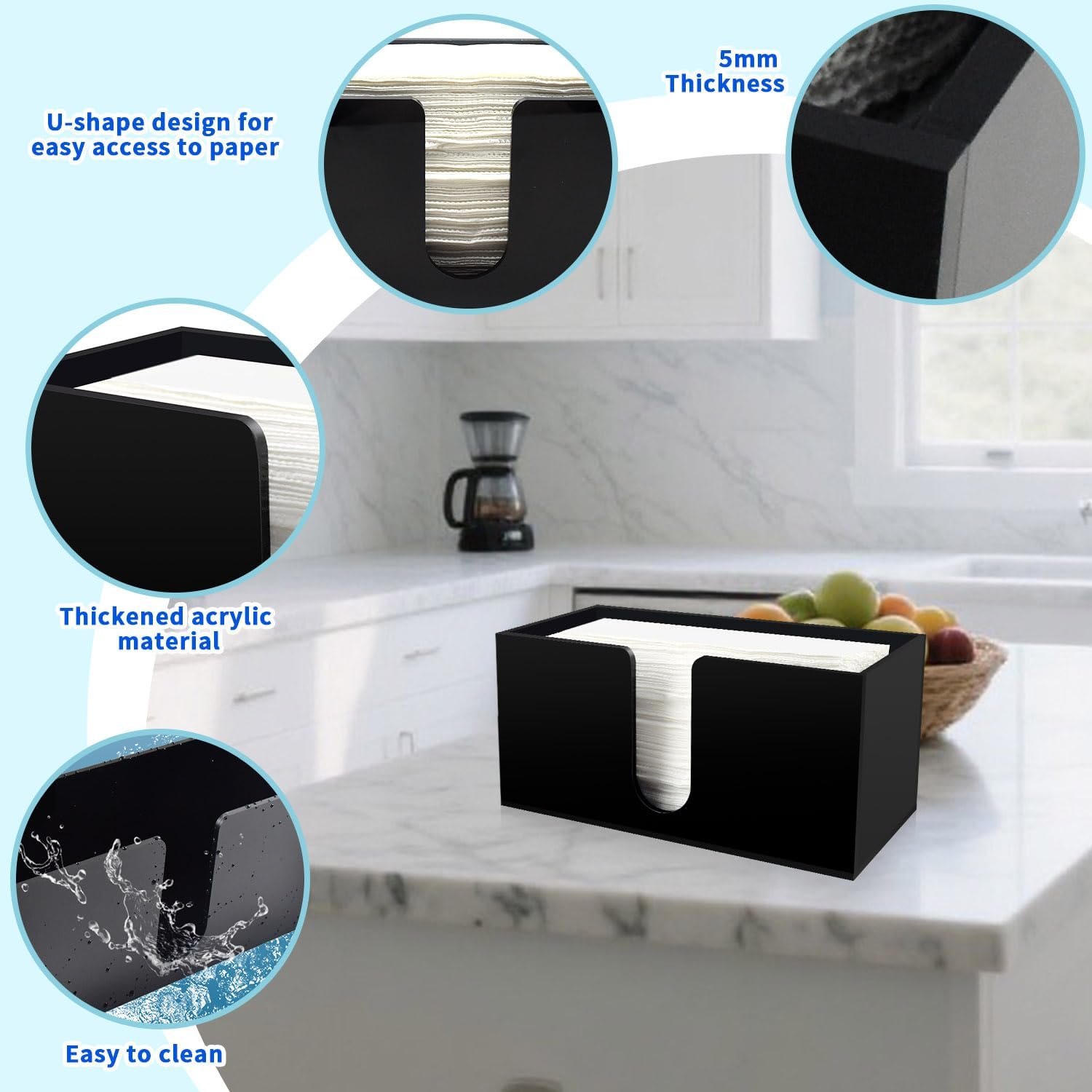 - Premium Black Acrylic Construction:5mm thickened black acrylic paper towel holder withstands daily wear, featuring impact-resistant & tear-proof design. Sturdy countertop paper towel dispenser maintains crisp modern aesthetics in bathrooms/kitchens while protecting towels from dust.