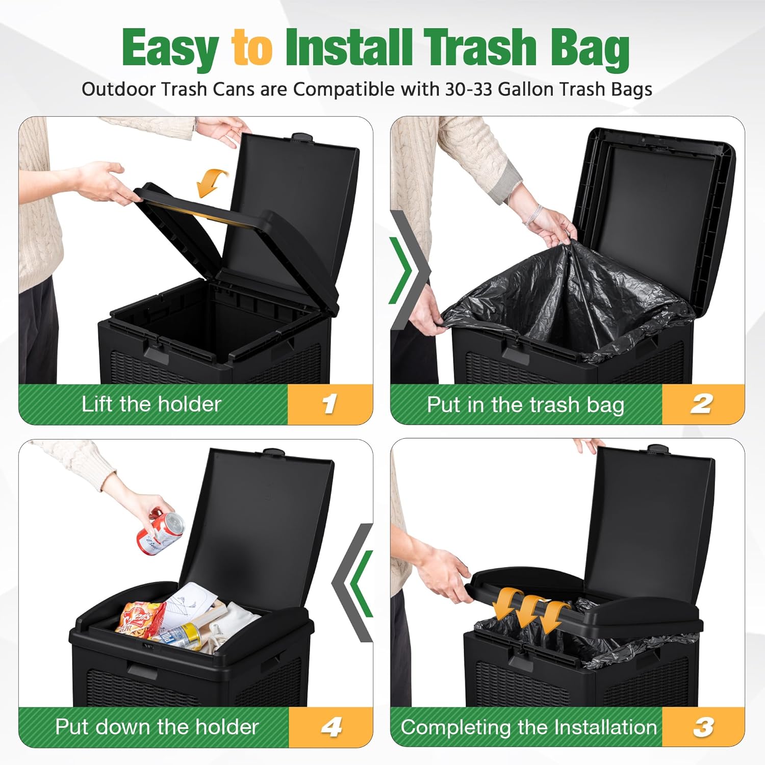 - Easy to Install Trash Bags: The waste bin for outdoors is compatible with 30-33 gallon trash bags. You need to lift the trash bag holder, put on the trash bag, put down the holder, and then finish the installation. After opening the inner lid, the garbage bag can be stably fixed in the card slot
