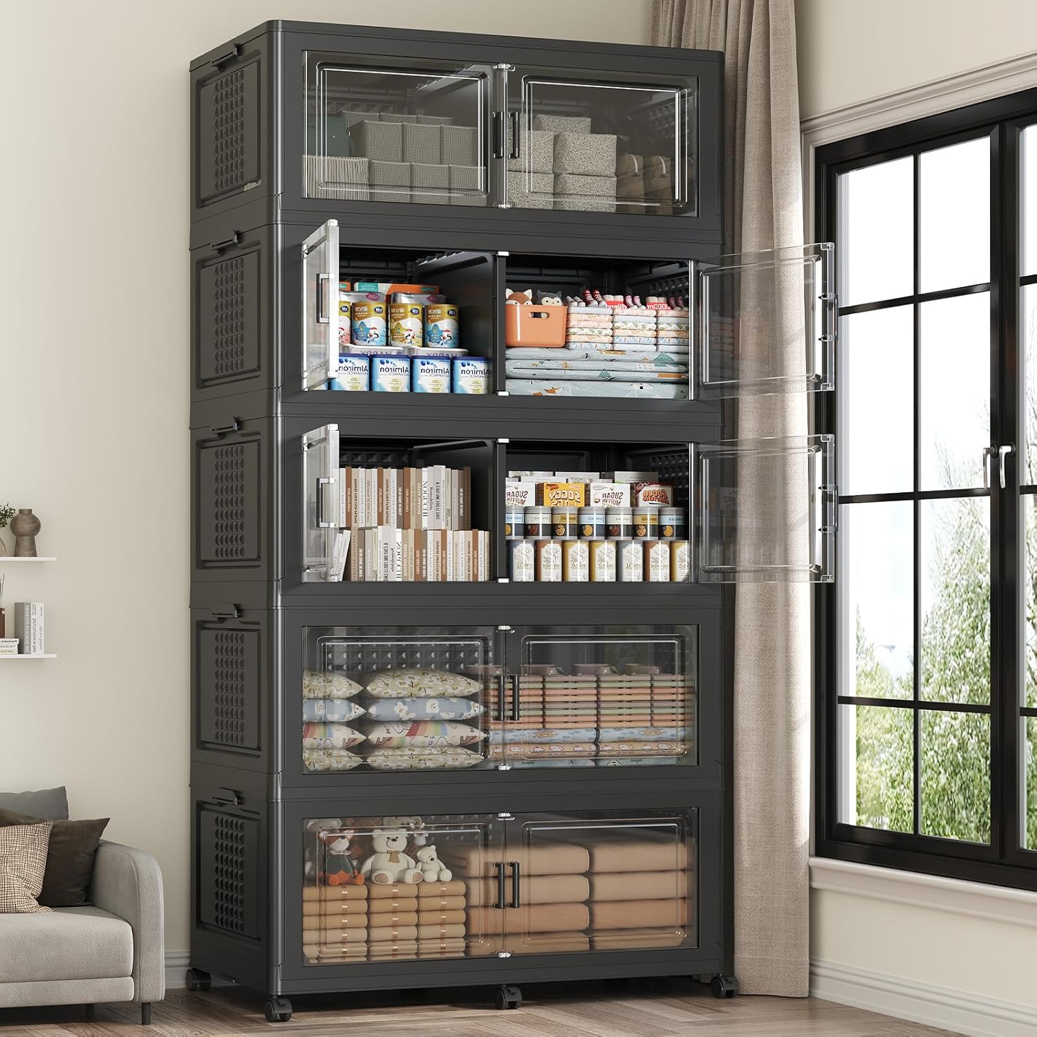 - 【Two Ways to Open & Clear Magnetic Doors】Fangtueh collapsible storage bins with lid and wheels feature a dual access way, allowing for both top and front door openings, and with clear windows for easy visibility. The stackable plastic storage bins with open front doors are equipped with magnetic lock buckles to prevent dust from entering the cabinet.