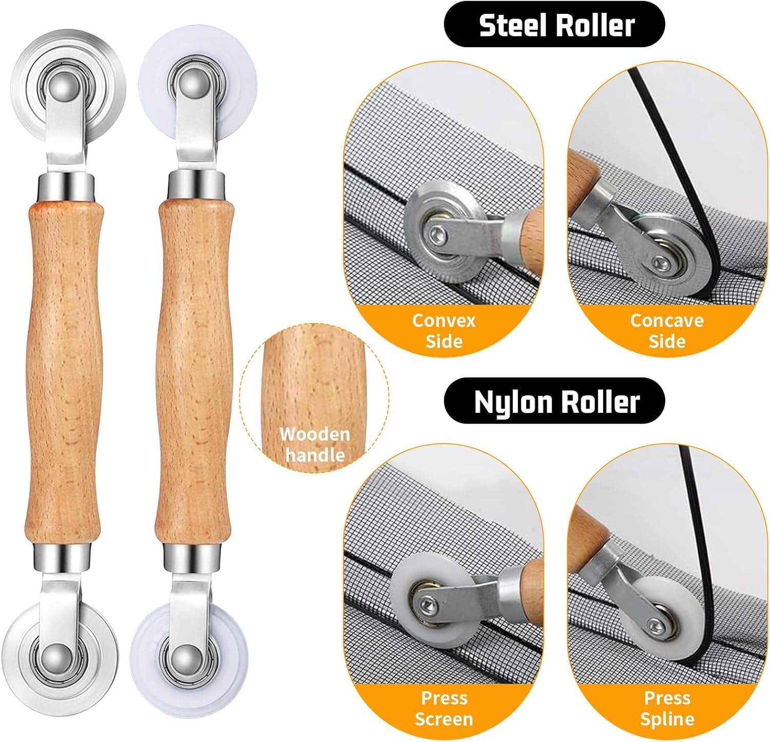 - Complete Accessories: (1) One pair of scissors: You can cut the screen mesh to the size you want according to the size of your window. (2) 50ft screen spline: Hollow design for easy pressing into the groove and fixing the screen. (3) Two rolling screen window tools: solid beech wood handle+double steel bearing metal wheel; Smooth edges that won't scratch the screen. (4) A spline hook: easy to move old splines. (5) 8 screen support clips: fixed windows, reusable (6) a multifunctional knife and a tape measure: help you replace the screen window more conveniently