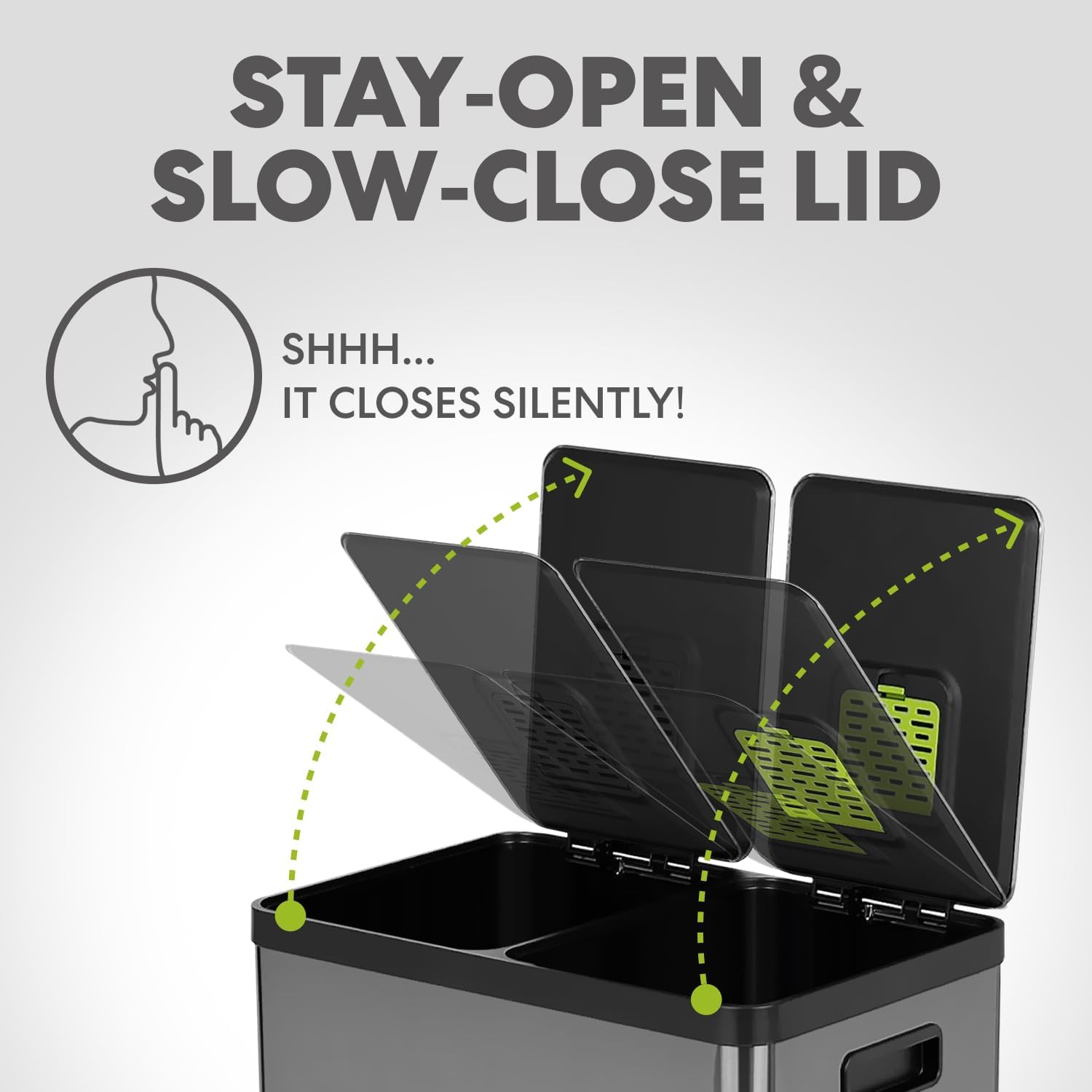 - SLOW CLOSE LID: Quiet, controlled lid closure is designed to reduce unwanted noise and ease down gently.LID LOCK: Extended open lid lock keeps the container open for longer tasks and chores.