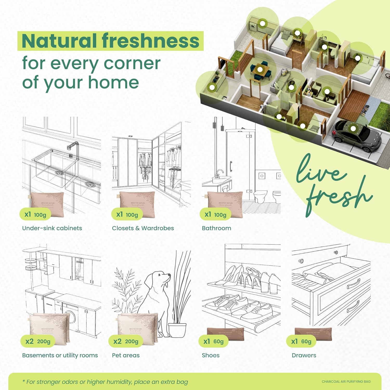 - STYLISH AIR PURIFIERS – Designed to blend seamlessly into any space, our charcoal deodorizer bags offer powerful freshness with a clean, modern look. Use them as a car charcoal odor eliminator or place them in your home to eliminate odors effectively