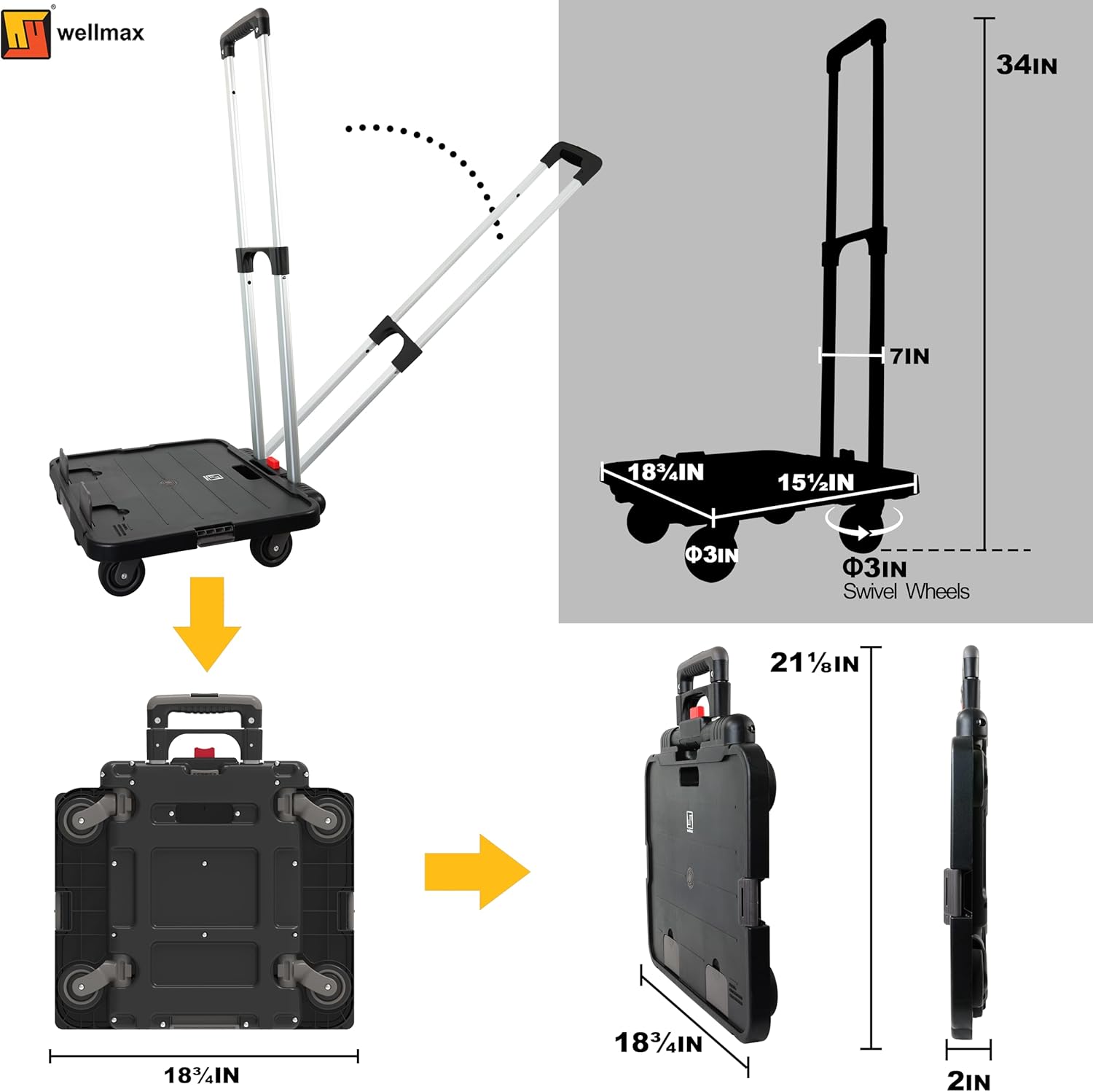 - Versatile 3-in-1 Design: Experience ultimate convenience with our patented Wellmax rolling crate, transforming effortlessly from a platform cart, to a spacious shopping cart, or a stackable storage crate. Ideal collapsible utility cart for groceries, office supplies, and classroom essentials.