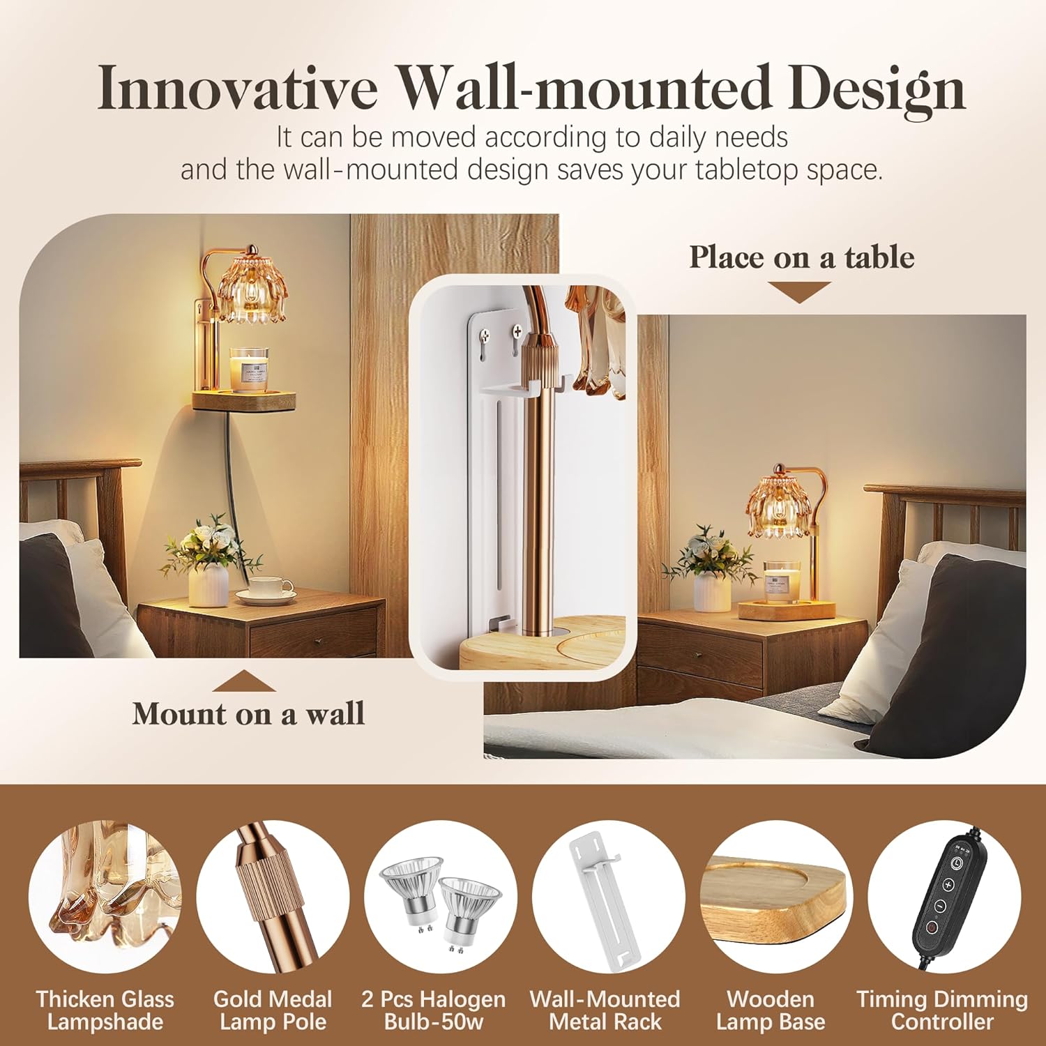 - Modern Decoration Wax Melt Warmer: Our candle warmer lamp with timer design is unique, featuring a wooden base, a metal gold lamp body, and flower glass lampshade as the main body, adding a touch of charm and coziness to any room, modern and luxurious. Wax warmer for scented wax creates a cozy atmosphere and casts nice ambient light. Perfect for enhancing moments of yoga, reading, entertaining, work, or sleep. Enjoying the fragrance with peace of mind, sleep and play anytime