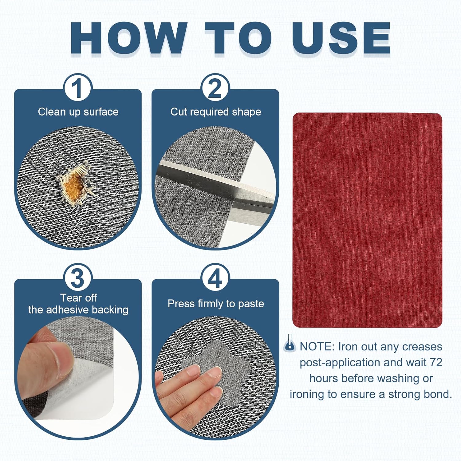 - Note: Iron out any creases post-application and wait 72 hours before washing or ironing to ensure a strong bond.