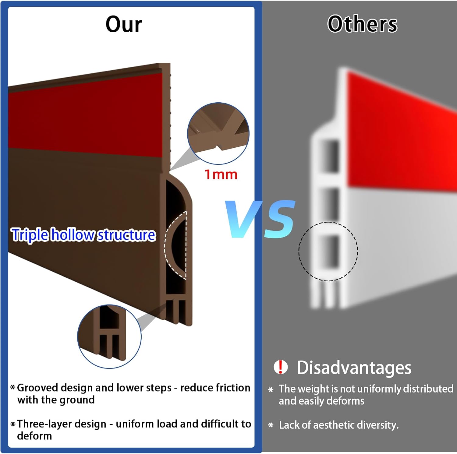 - Triple-Layer Hollow Design: Our door draft stoppers for bottom of door adopts a triple-layer hollow structure that evenly pressure during floor contact when opening the door /closing the door. There is a 1mm groove in the center of the door sweep, which can be bent and adjusted, extend service life while making door opening and closing smoother