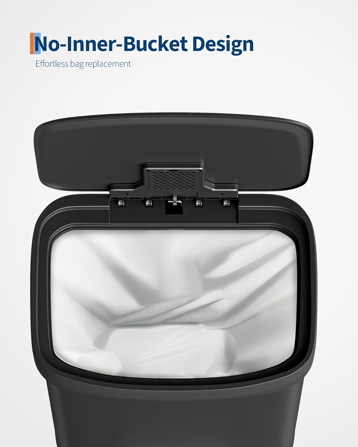 - [PRACTICAL DESIGN] – The Garvee’s tall step-on kitchen trash can prioritizes ease of use with an ergonomic rear handle for effortless lifting and relocation. The soft-close lid opens smoothly to 80° without hitting island edges and locks at 95° for hands-free cooking prep and scrap disposal. The integrated liner rim secures any standard bag snugly to prevent slips, bunching, or overhang