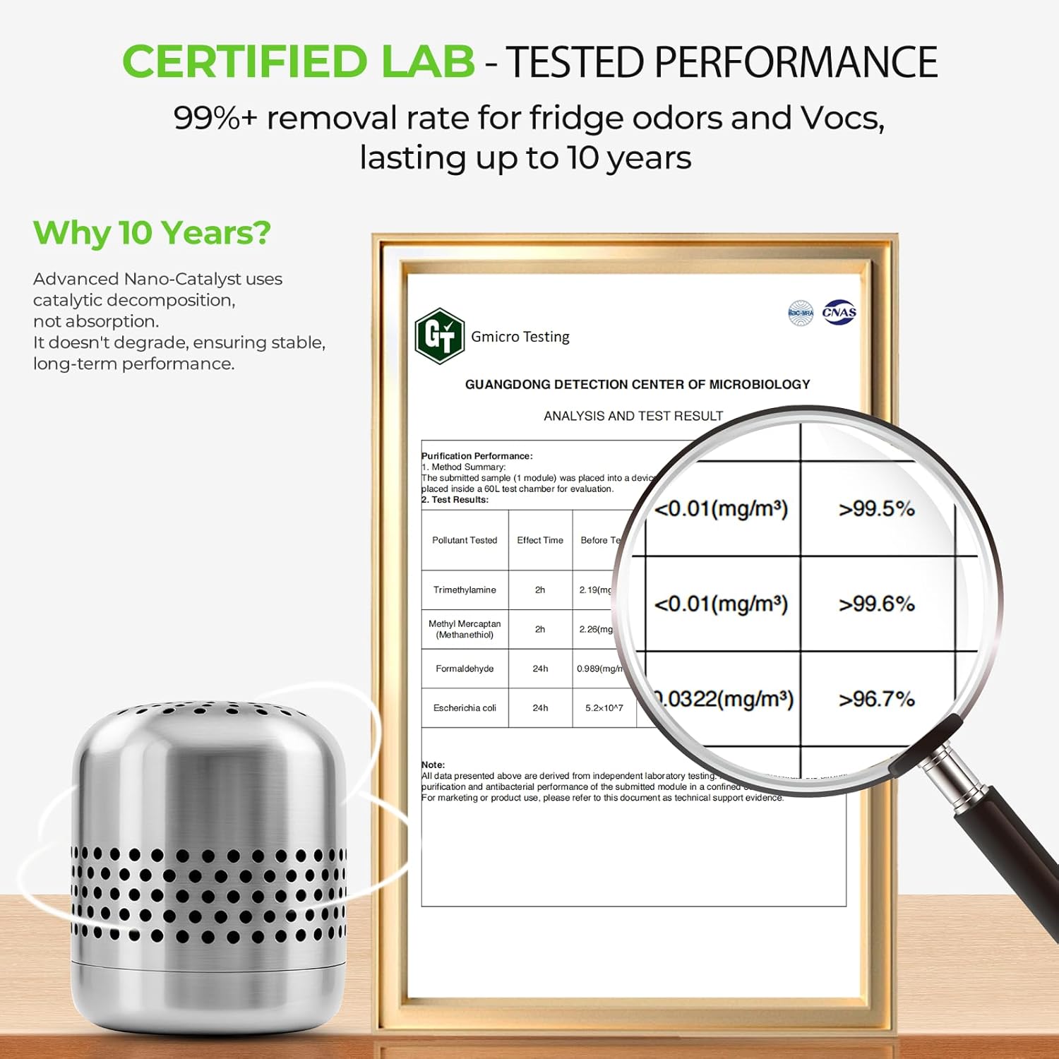 - ๐๐๐ฏ๐๐ง๐๐๐ ๐๐๐ง๐จ-๐๐๐ญ๐๐ฅ๐ฒ๐ญ๐ข๐ - No more lingering fridge odors. Our refrigerator deodorizer features an advanced composite nano-catalyst that breaks down harmful VOCsโlike formaldehyde, benzene, and tolueneโinto harmless substances.