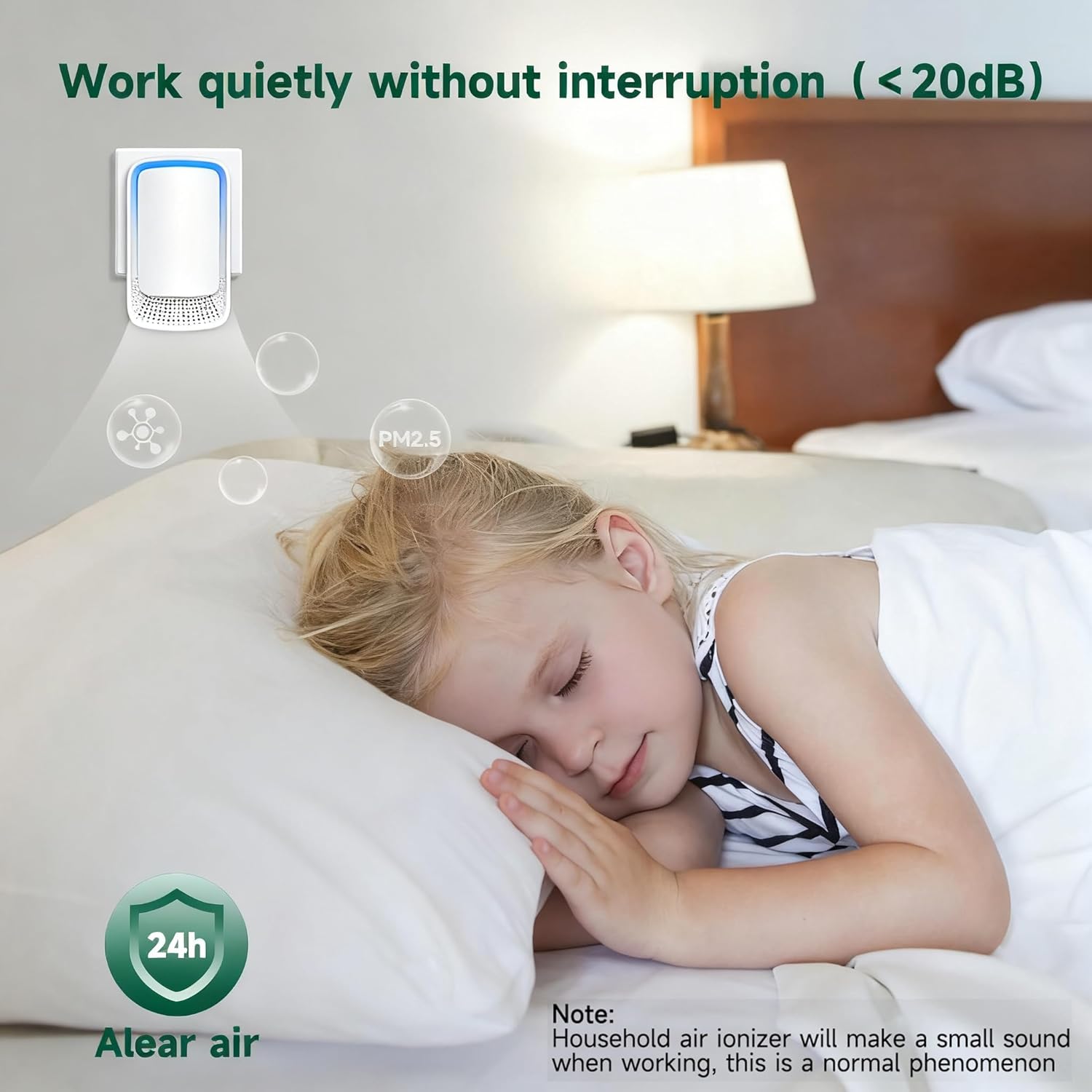 - Silent Operation:Negative ion generator Low power consumption, safer and more energy efficient.Designed for harmonious home environments, this compact negative ion purifier operates virtually silently. Simply plug it in for continuous background operation, safeguarding your peaceful and relaxing space.
