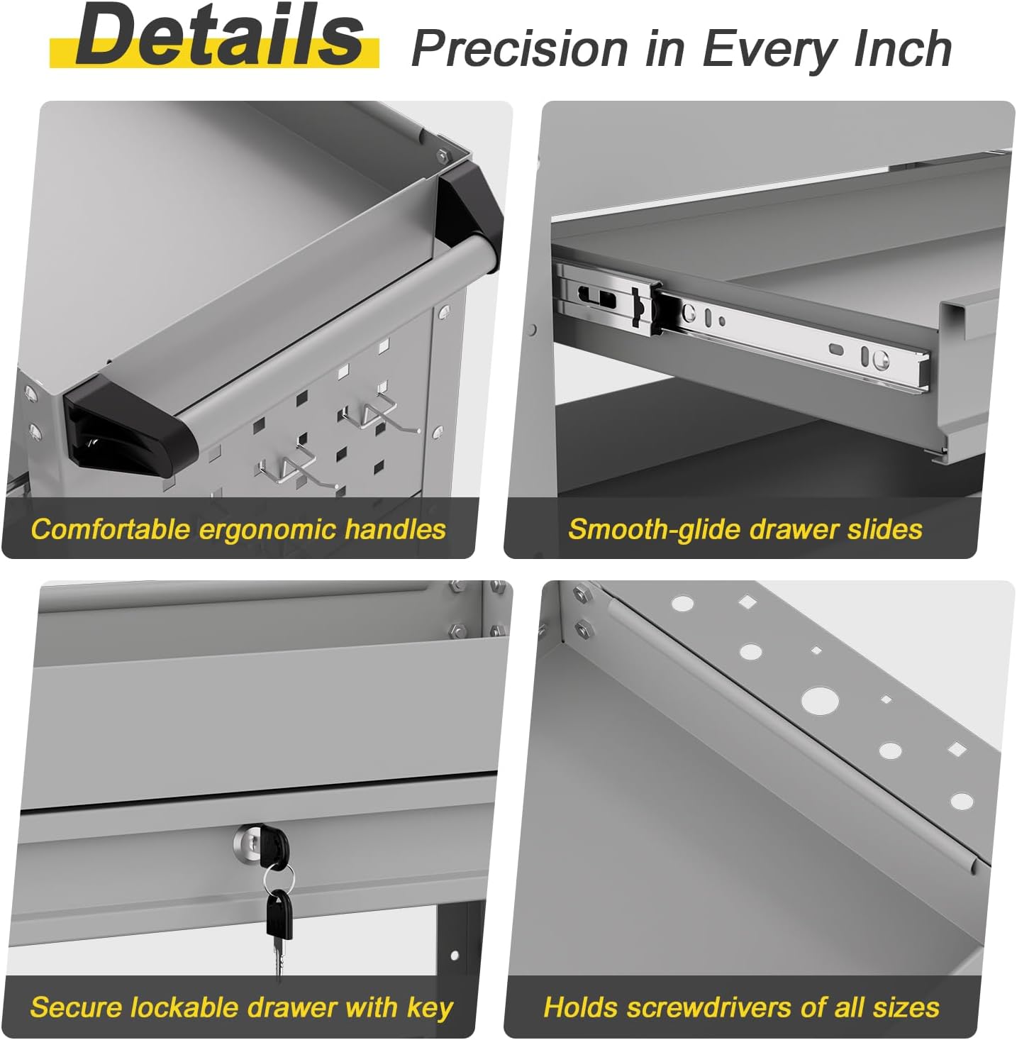 - Ample Tool Storage β This rolling tool cart with drawers features 3 trays, 1 lockable drawer, side hooks, and panels for tools and accessories. Ideal tool cart on wheels for shops and home use.