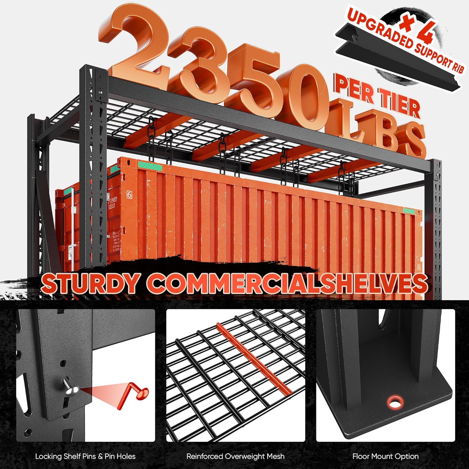 - ă 9400LBS Extra Heavy Duty Garage ShelvingăBepatio extra storage shelves units is constructed with reinforced steel beams on the sides, each column is wider and thicker than the standard model, and 4 extra support bars for added stability. With a total load capacity of up to 9400LBS, whether you are storing large containers or heavy machinery, our garage shelves can meet your needs.