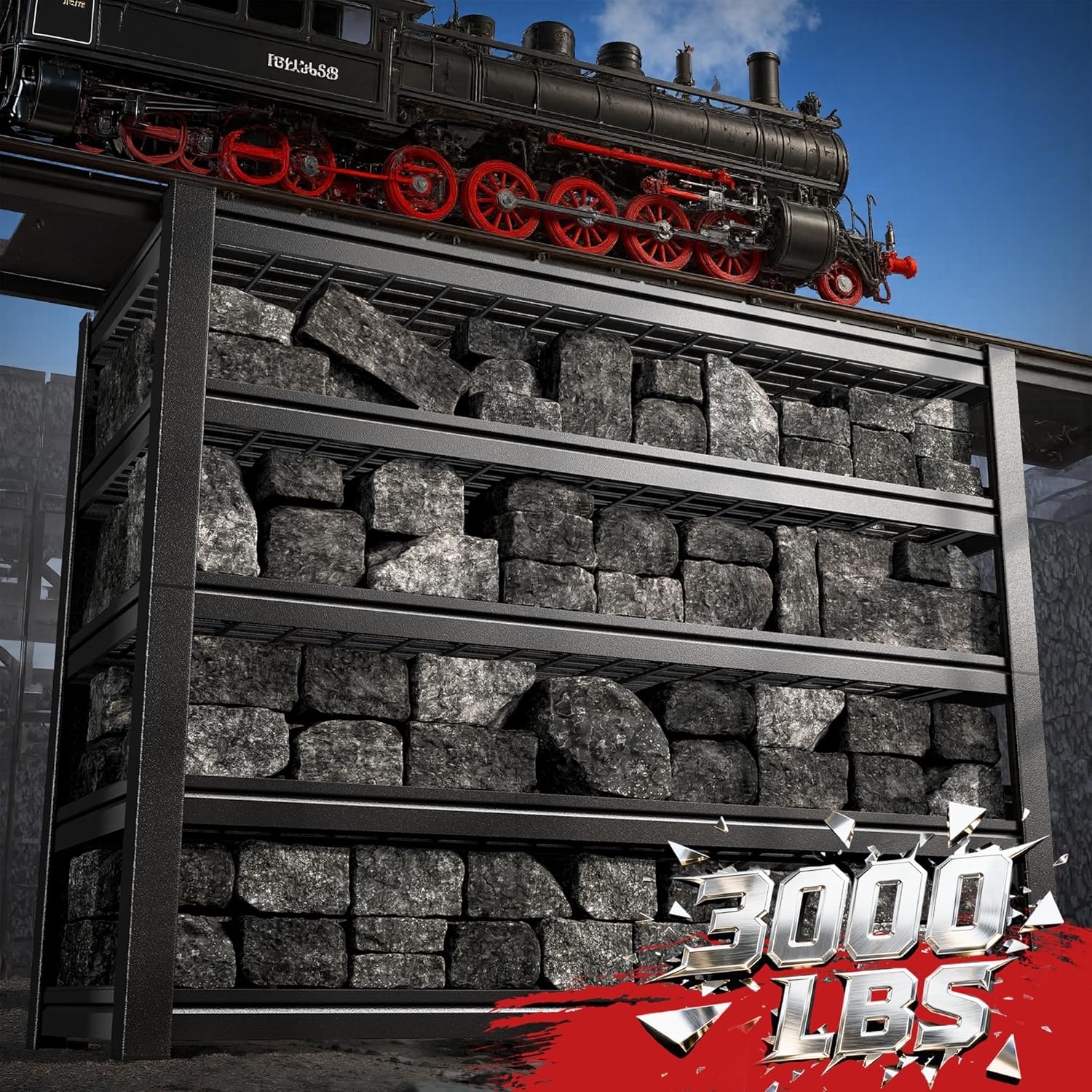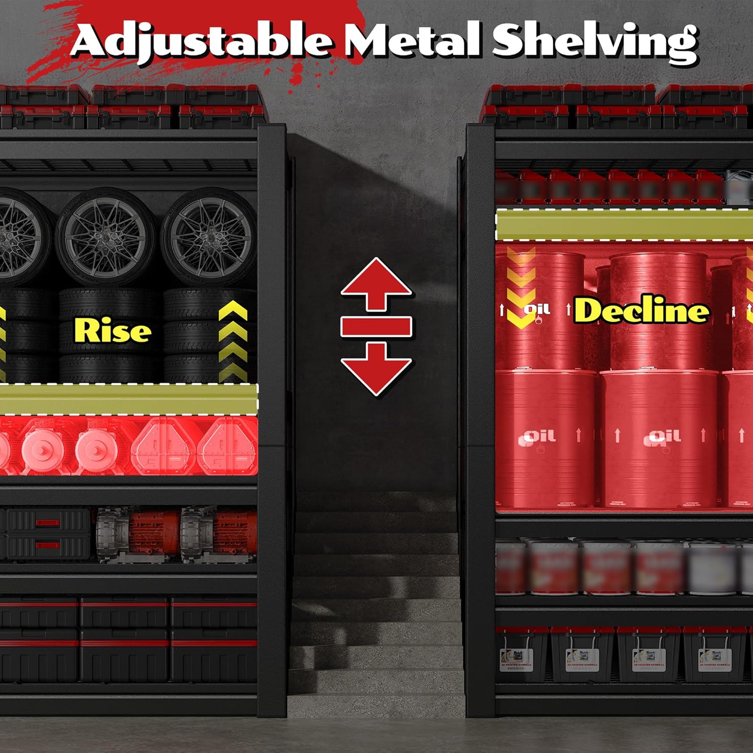 - ăDouble Layer Upright Design and Heavy Duty Reinforced Metal ConstructionâăThis garage shelving features a double-layer upright design, that are wider and thicker than ordinary shelves. Each tier includes added support rods, delivering a 600 lbs per shelf capacity and a total load capacity of 3000 lbs. This industrial-grade build ensures maximum stability and safety for heaviest tools and equipment, providing complete peace of mind